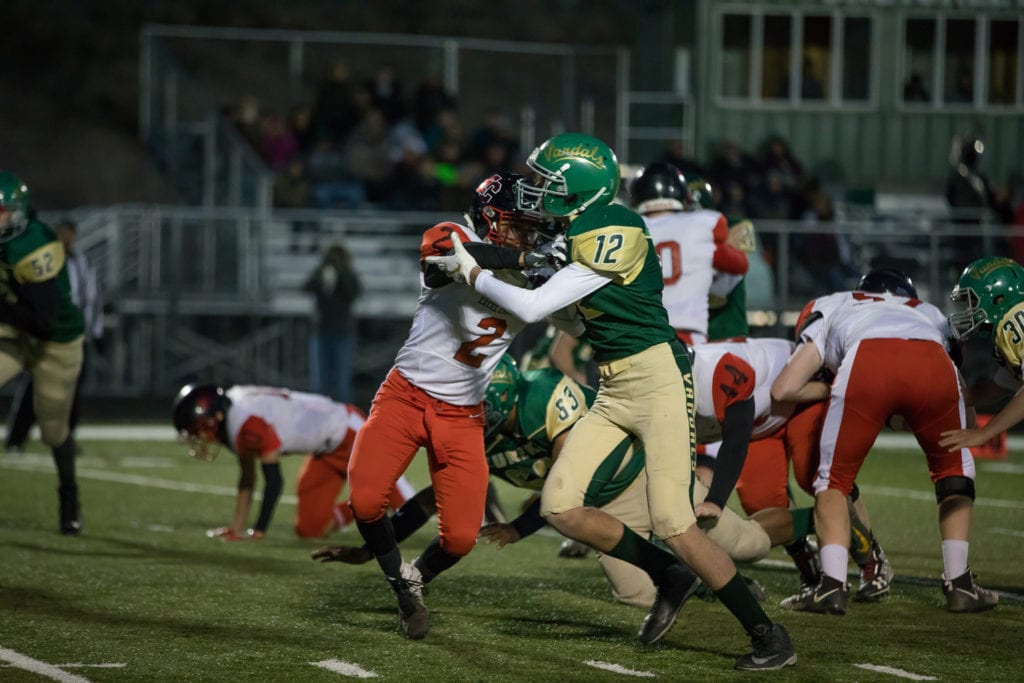 Eureka junior Zach Garcia battles an Excel Christian defender in the first round of the playoffs Nov. 3. The Vandals had their season ended Saturday after falling to Tonopah 68-20 in the state semifinals. After falling behind 16-0 in the first quarter, Eureka scored a pair of touchdowns in the second but couldn’t overcome the Muckers offensive attack and trailed 38-14 at half. Tonopah will face Spring Mountain in the 1A title game on Saturday after they knocked off Virginia City 41-24. Eureka finished the season 10-2 overall.