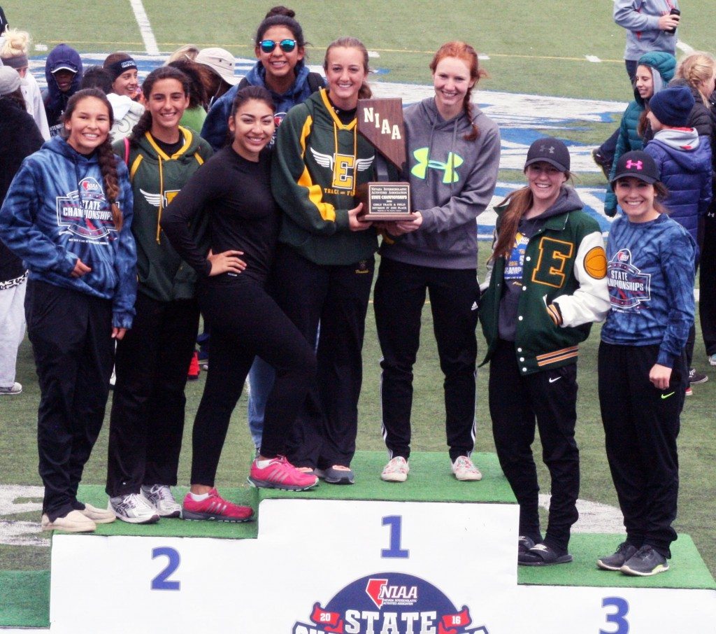 L to r: Cody Gibbs, Elsie Etchegaray, Angelika Townsend, and Jiselle Dominquez the girls 4×100 relay team placed first earning them the State title