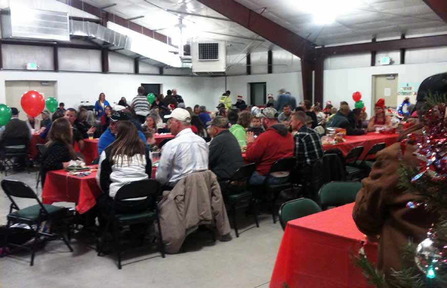 Upon arrival each townsperson received a ticket for dinner and a ticket went into a box for drawings for Christmas gifts. A gingerbread house decorating contest challenged the 20+ children and adults at each row of tables to combine their artistry affixing gum drops, candy canes, icing and other Christmas candy to gingerbread houses on their table. Everyone at the winning table received a box of mini-candy canes. Boxes of gifts and prizes sat on one table and another table bore gifts for children in the community bought with a donation from Klondex Mining. Bruce and Linda Harland won the Christmas decorations and lights contest. Cathy Wolf won the ‘Ugly Christmas Sweater Contest.’ A lucky Crescent Valley resident won a weekend at the Nugget and another won a quilt and another won the raffle sponsored by Search and Rescue for a rifle.