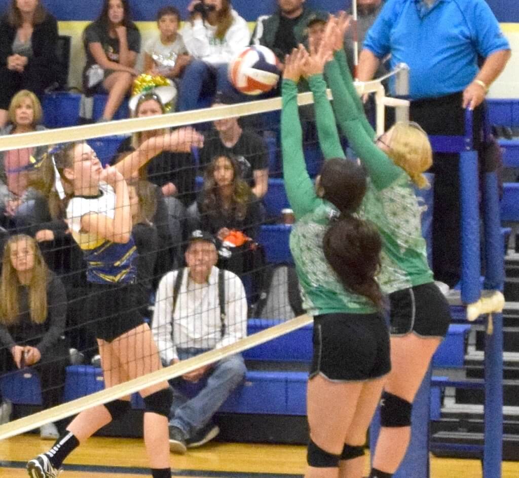 Two Eureka players block a hit by a Pahranagat Valley player in their match at the Region II tournament in Alamo. Pahranagat Valley won though 3-0, ending Eureka’s season.