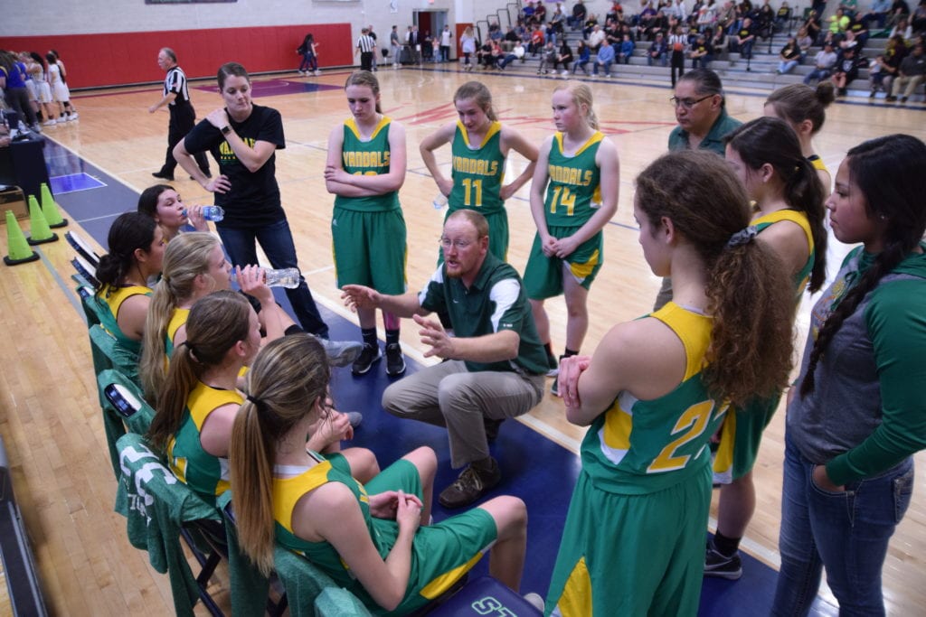 Eureka County High girls basketball coach Travis Gallagher talks to his team during the 1A state semifinals last Friday in Las Vegas. The Vandals topped Coleville to reach the title game Saturday but fell to Mineral County, 40-35.