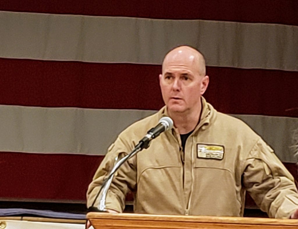 Capt. David Halloran, Commanding Officer of the Fallon Range, explains the need for training land expansion at a public meeting in Hawthorne Monday.