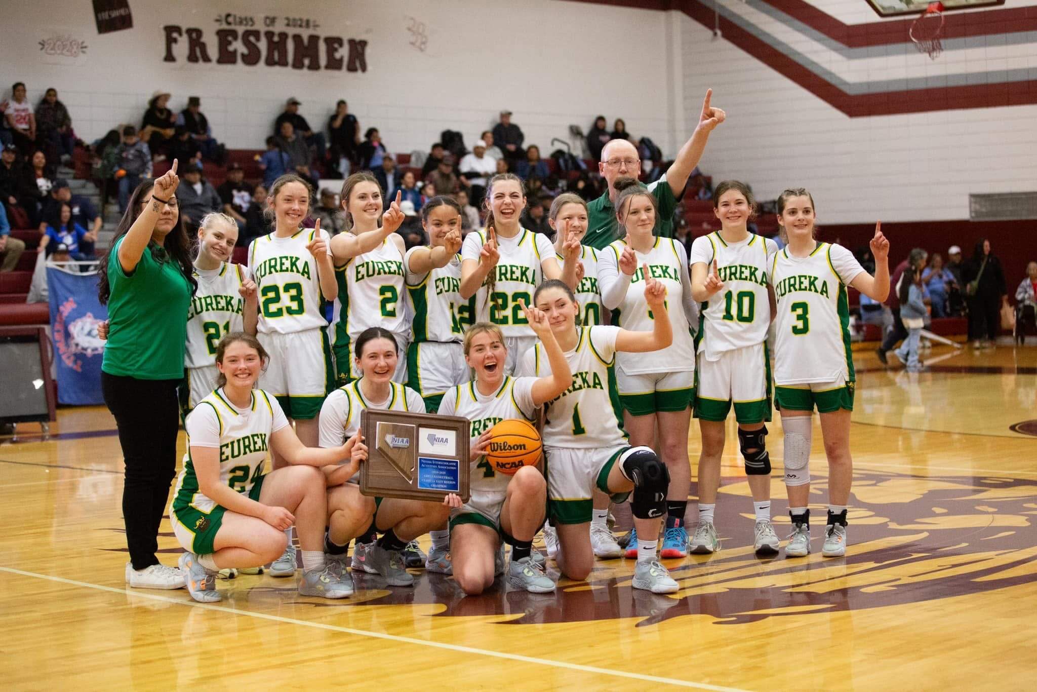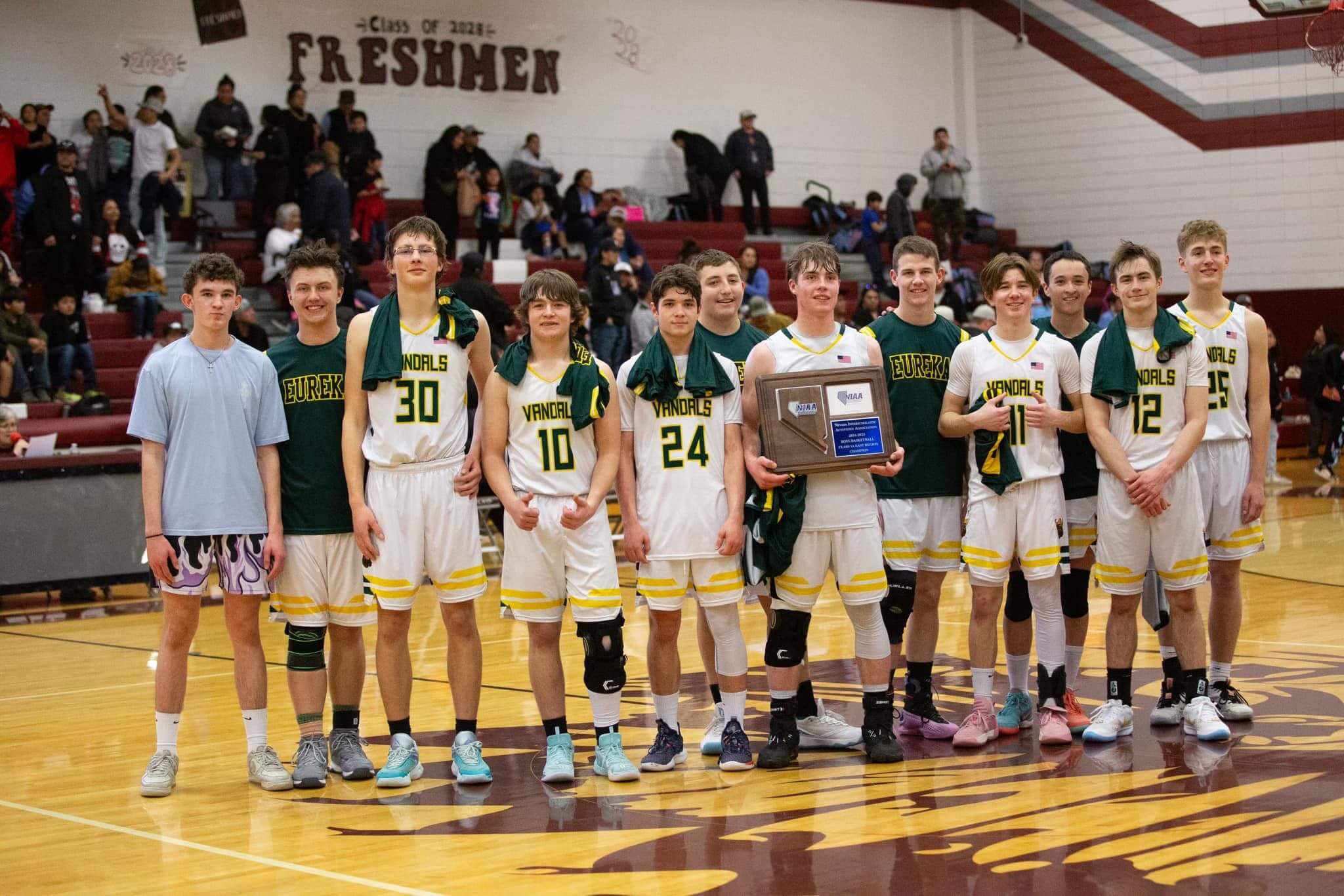The Vandal boys defeated McDermitt, 41-33, in the regional semi-final Feb. 14. They then beat the Owyhee Braves in a nail-biter of a game on Feb. 15 to capture the regional title. With the Vandals down by two in the final few seconds of the game, sophomore guard Dean Benson came in with the clutch shot, sinking a triple to give Eureka the 41-40 win.