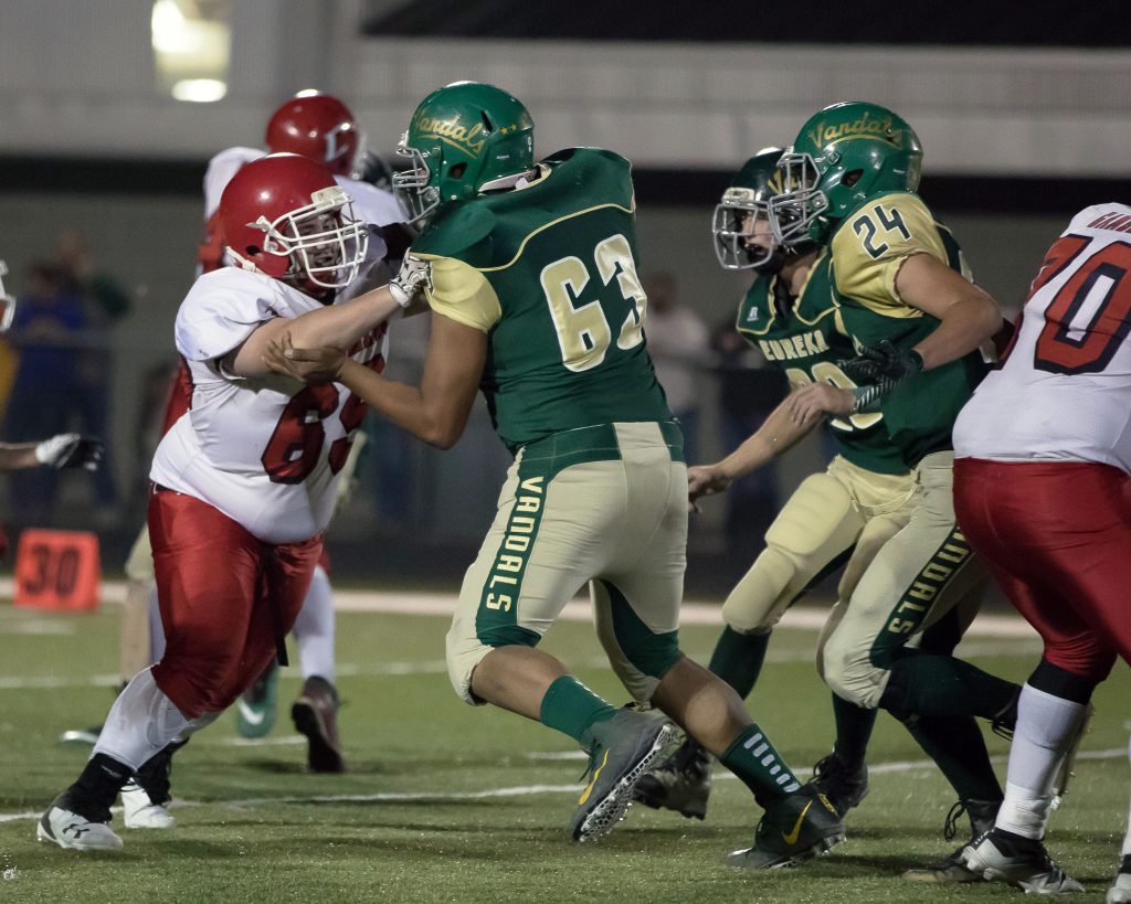 Eureka senior Tristan Birchim (63) blocks out a Carlin player during the Vandals 48-14 win last Friday.