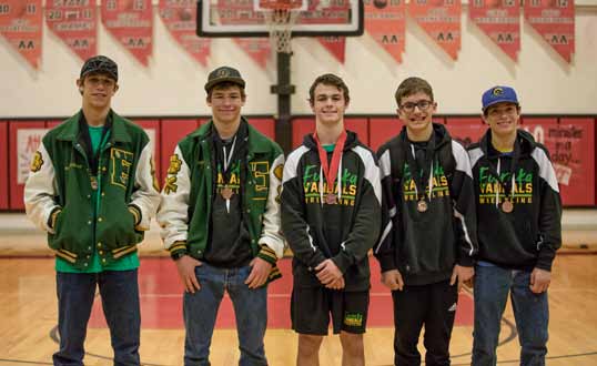 The Eureka County High wrestling team had all five of its athletes qualify for the state tournament this weekend in Winnemucca. From left, Preston Hubbard; Chris Drayton; Wyatt Anderson; Ivan Pickard and Quade Fillipinni.