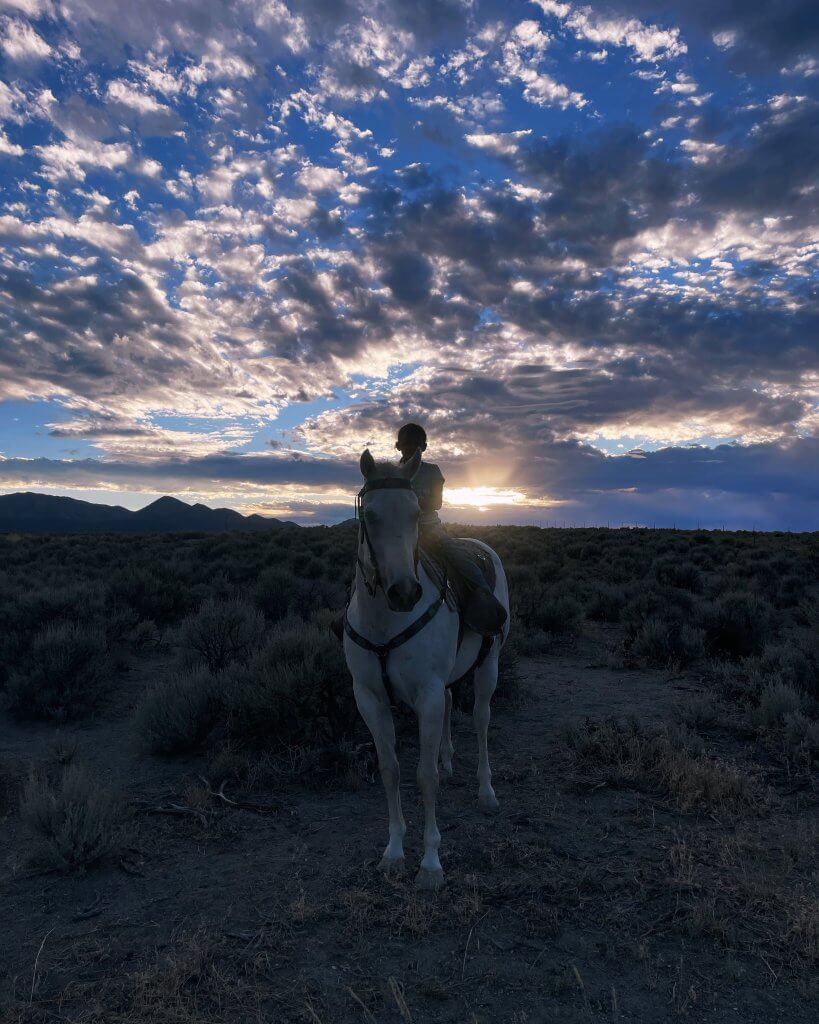 Remi’s photograph captures a breathtaking scene of rider and horse set against a dramatic Eureka County sky. The silhouette of the pair stands tall in the sagebrush as golden light breaks through the clouds, creating a powerful contrast of shadow and color. The image reflects the quiet strength of ranch life and the timeless bond between people, animals, and the land.